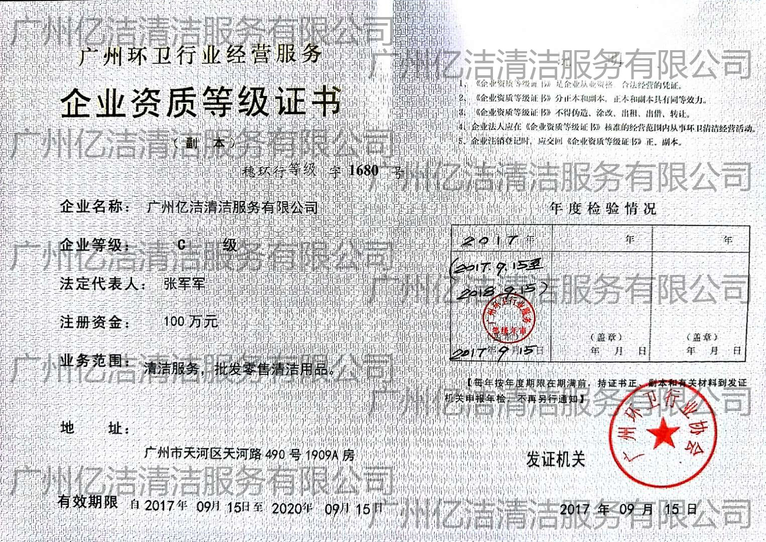 廣州億潔清潔服務(wù)有限公司是經(jīng)廣州市工商行政管理局批準(zhǔn)成立的(注冊資本:100萬元人民幣)。具有獨(dú)立法人資質(zhì)。公司成立2015年,公司具備完善的管理體系和高素質(zhì)管理隊(duì)伍,擁有特種技術(shù)人員33名,保潔服務(wù)人員上萬名,覆蓋廣州市,能及時調(diào)配并快速投入高效運(yùn)行。我們的每個員工都經(jīng)過公司的嚴(yán)格篩選,嚴(yán)格培訓(xùn),定期培訓(xùn)后持證上崗以保證服務(wù)品質(zhì),保障客戶的權(quán)利,利益,形象等不受損失。 廣州億潔清潔公司是一家設(shè)備齊全,技術(shù)強(qiáng)大的綜合型清潔服務(wù)公司,為客戶提供完善服務(wù)尊定了堅(jiān)定的基礎(chǔ)。 司于2010年全面推行了ISO9001質(zhì)量管理體系認(rèn)證和ISO14001國際環(huán)保體系認(rèn)證。先后獲得廣州高層建筑外墻清洗維修作業(yè)【安全資質(zhì)證書】、【廣州環(huán)衛(wèi)企業(yè)等級證書C級資質(zhì)】、廣州疾控中心頒發(fā)的【四害消殺服務(wù)資質(zhì)證】、【空氣治理A級資質(zhì)】、中國石材協(xié)會頒發(fā)的【石材資質(zhì)B級資質(zhì)】等。 廣州億潔清潔服務(wù)有限公司致力于打造專業(yè)、實(shí)惠、靠譜的保潔服務(wù)公司,把專業(yè)的事情交給專業(yè)的我們,您放心! 億潔清潔服務(wù)項(xiàng)目: 廣州保潔服務(wù):新建樓宇、別墅、酒店、醫(yī)院、辦公樓、賓館、企事業(yè)單位廠房竣工后開荒及裝修后精細(xì)保潔.工程保潔服務(wù)。 廣州物業(yè)托管:為廣州市各大企事業(yè)單位、賓館、政府機(jī)關(guān)、小區(qū)物業(yè)、酒店及廠房提供專業(yè)化保潔、園林、設(shè)施維護(hù)等管理服務(wù)。 廣州高空作業(yè):高空玻璃幕...[詳情]